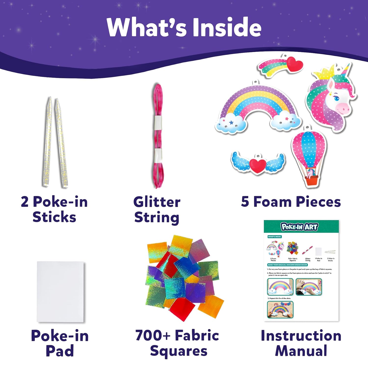 - POKE-IN ART ACTIVITY: This mess-free activity set sparks creativity as kids create their own magical unicorn dream decor by decorating unicorn-themed foam shapes with sparkly fabric squares and string them all together with the glitter string! It's the perfect way to brighten up a room with DIY room decor!