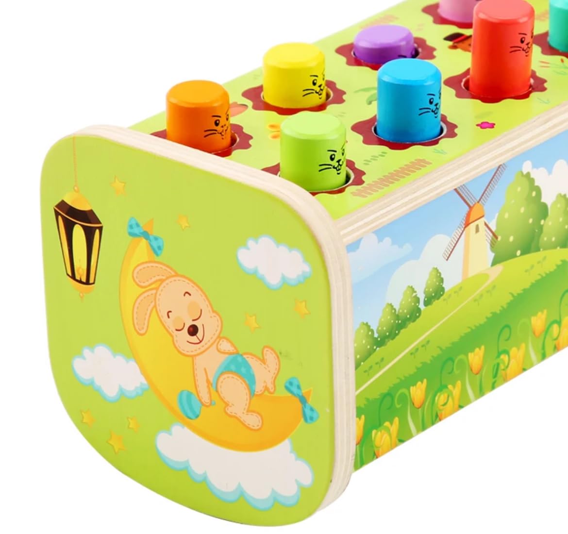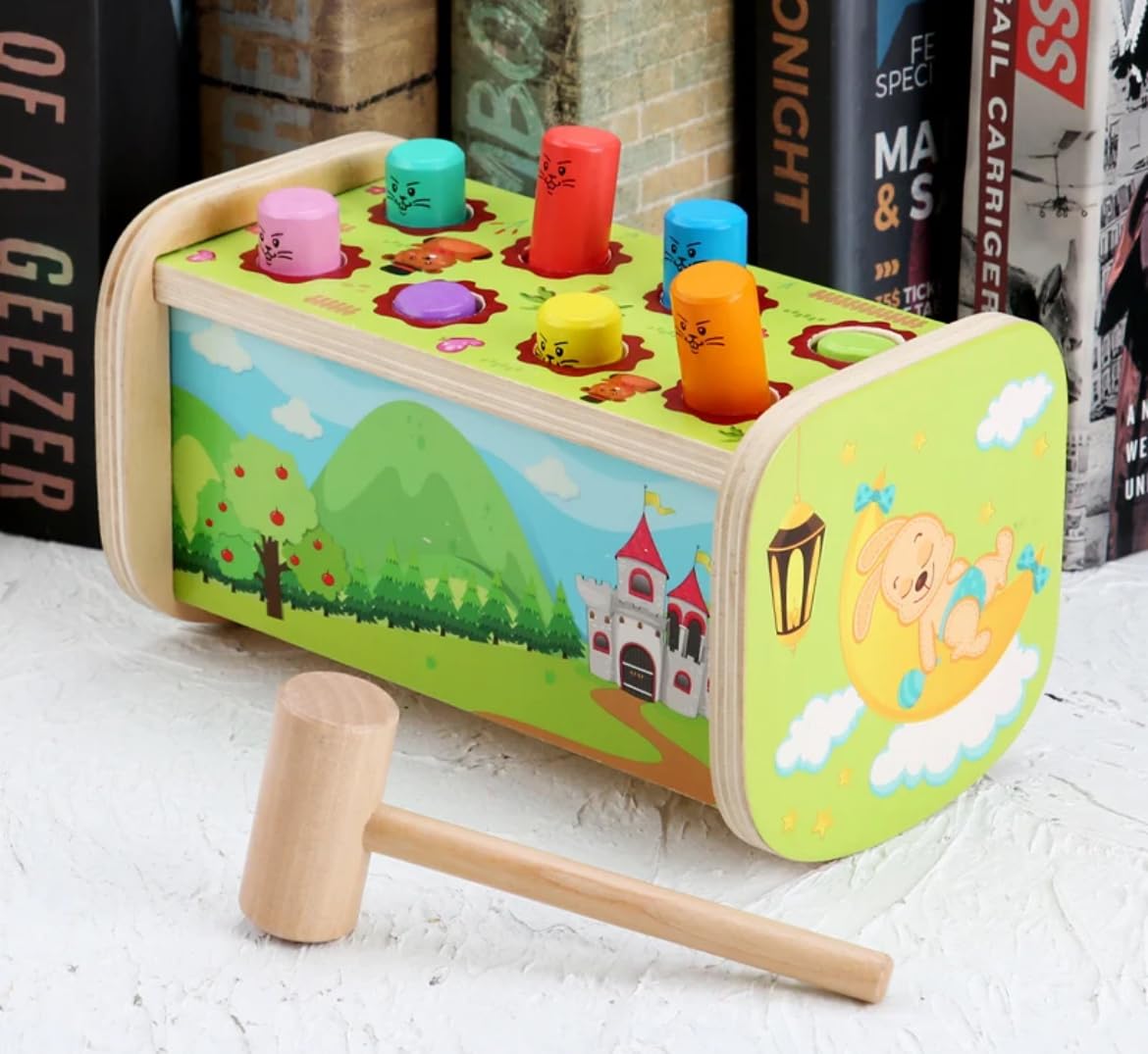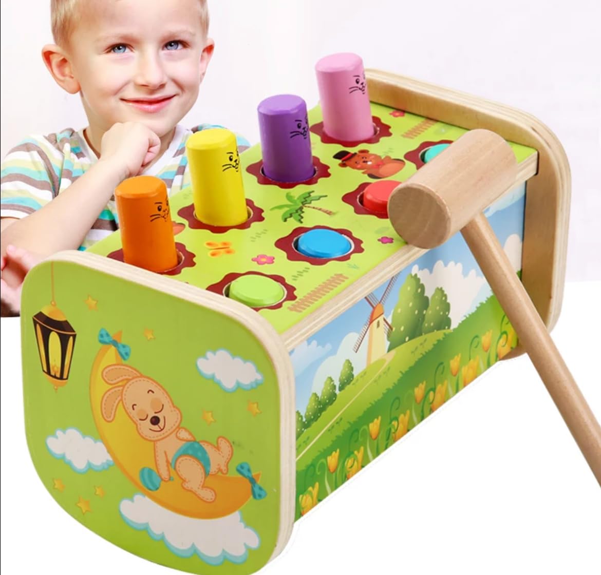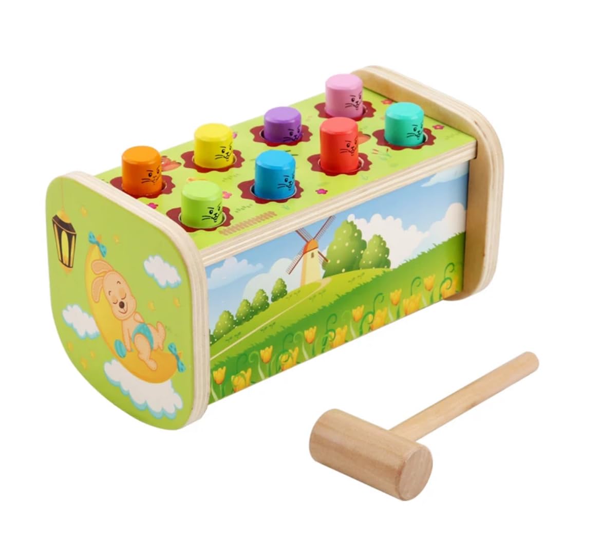 - Develops Fine Motor Skills: The action of using the hammer to hit the pegs helps enhance fine motor skills, hand-eye coordination, and muscle strength, which are crucial for early childhood development.
